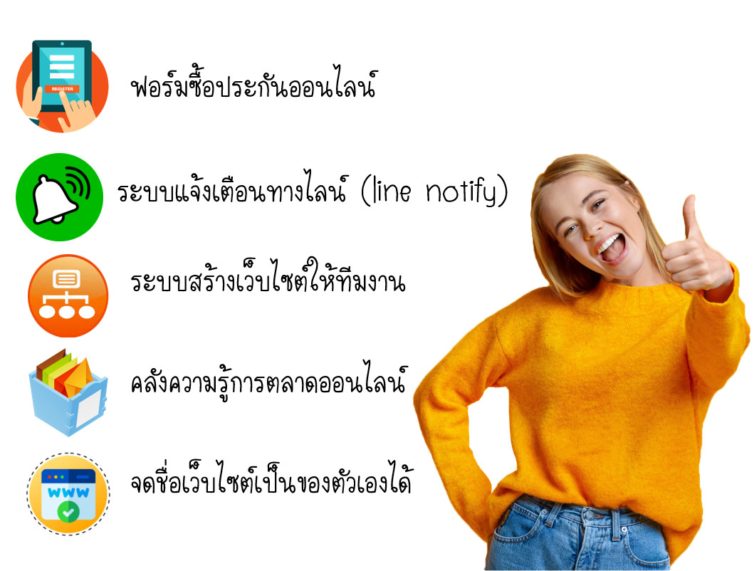 ให้คุณเป็นเจ้าของเว็บไซต์ขายประกันชีวิตออนไลน์ มูลค่า 10,000 บาท พร้อมระบบหลังร้าน ทีมงานอัพเดรทข้อมูลข่าวสารต่างๆ ระบบแจ้งเตือนเหมือนมีเลขาส่วนตัว สอนสร้างเพจ ยิงแอด คลังรูปภาพสำหรับทำการตลาดออนไลน์ ข้อความสำเร็จตอบ inbox เพจ ไลน์กลุ่มห้องเรียนรู้ ติดตามข่าวสารโปรโมชั่นต่างๆ ของบริษัทฯ